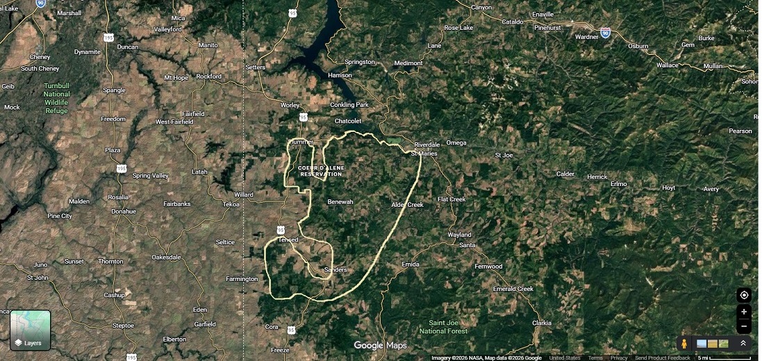 Coeur d'Alene Reservation was considered a "Former Reservation" for much of the 20th century. However, they promoted that because of the new smaller Coeur d'Alene Reservation created after land allotments were handed out and surplus land was ceeded. Those land allotments became the new smaller Coeur d'Alene Reservation! We can't determine correct demographics of Coeur d'Alene Reservation because the preserved land has been extremely violated. That's why demographics are not included! There are two communities within Coeur d'Alene Reservation where Ojibwa's make up a large proportion of it's population. De Smet is Coeur d'Alene Reservation's only predominantly Native American community. Plummer is near half Native American. West portion of Coeur d'Alene Reservation is the surplus land that was ceded. From Plummer to De Smet to St. Maries is Coeur d'Alene Reservations correct boundaries. It's nearly all mountainous.