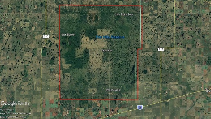 Location of this Ojibway Reserve is south central Saskatchewan. Below is a map of File Hills Ojibway Reserve. Within File Hills Ojibway Reserve are four Districts: Little Black Bear, Okanese, Peepeekisis and Star Blanket. This Ojibway Reserve in Saskatchewan was originally much larger. Original name of the Ojibway Reserve that File Hills Ojibway Reserve was within, was Qu'Appelle Reserve. It included these follwing Districts: